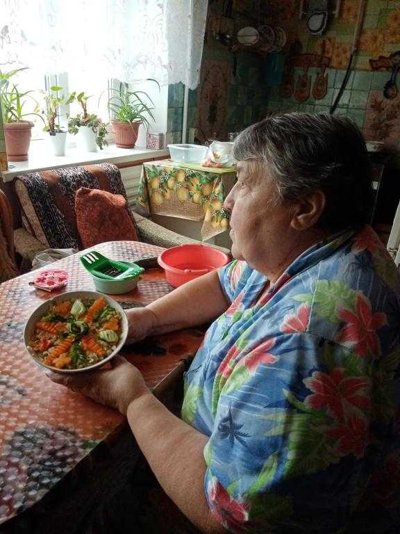 11 октября в отделении социальными работниками Натальей Говорухиной, Ларисой Горожанцевой, Еленой Ковлягиной, Еленой Нагановой проведено плановое занятие по креативному досугу с получателем социальных услуг Ниной Александровной Новиковой «Каждому овощу свое время», в ходе которого они приготовили салат «Оливье».